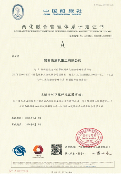 陜柴作為工信部兩化融合管理體系貫標試點企業,于2019年8月正式啟動兩化融合管理體系貫標工作,并于2021年9月通過評定機構審核取得評定證書,2022年7月通過評定機構監督審核,目前體系正常有效運行。