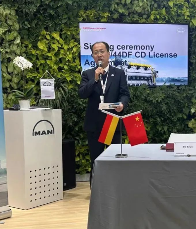 12月6日,中國船舶集團旗下中國動力子公司陜柴重工、中國船舶工業貿易有限公司、MAN公司在2023年中國國際海事會展上舉行了MAN 35/44DF CD發電機組專利許可協議簽訂儀式,標志著陜柴重工成為國內首家獲得該機型許可證的生產廠商。陜柴重工總經理、黨委副書記孫志宏、副總經理雷軍、謝占成與中船貿易總經理胡凱、MAN亞太區負責人薩拉斯等領導共同見證了簽訂儀式。